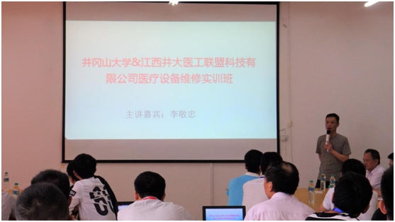 6月22日上午8点30分,井冈山大学&江西井大医工联盟科技有限公司医疗设备维修实训班(第一期)在井冈山大学机电工程学院实验楼三楼举办,井冈山大学机电工程学院院长肖冠云,党委书记彭福华,机电工程学院生物医学工程系主任李源;江西井大医工联盟科技有限公司董事长张春林,总经理张爱平出席本次开班仪式,共计近50位医工学员参加此次培训。
